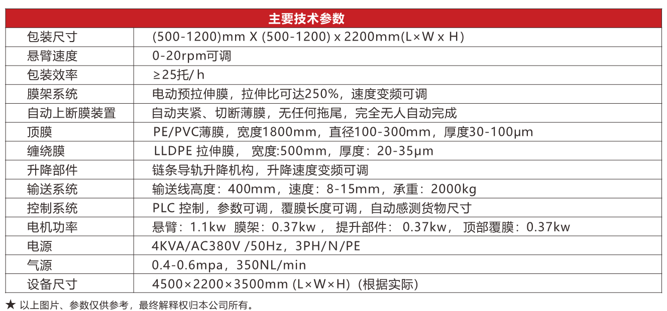 QS系列全自動懸臂纏繞覆膜包裝機是懸臂纏繞包裝機增加覆膜功能而成的集成一體式包裝設備,能夠完成纏繞包裝和頂膜覆蓋兩種功能,可將形成五面封閉的防潮、防雨、防塵的包裝體。實現無人化自動運行,效率高,包裝成本低,廣泛應用于食品飲料、化纖化工、冶金建材等行業(yè),是提高自動化程度的好設備。
